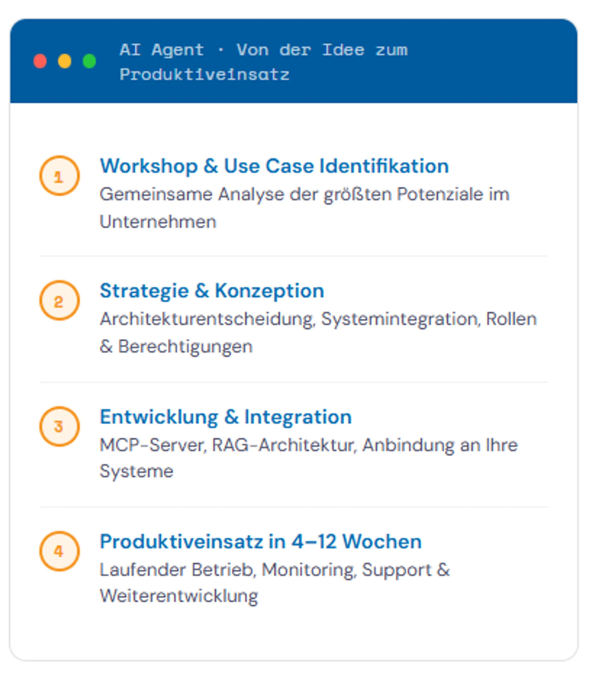 Wir entwickeln maßgeschneiderte KI-Agenten für Ihre konkreten Prozesse und Anforderungen, mit eigener Identität, definierten Rollen und direktem Systemzugang.
