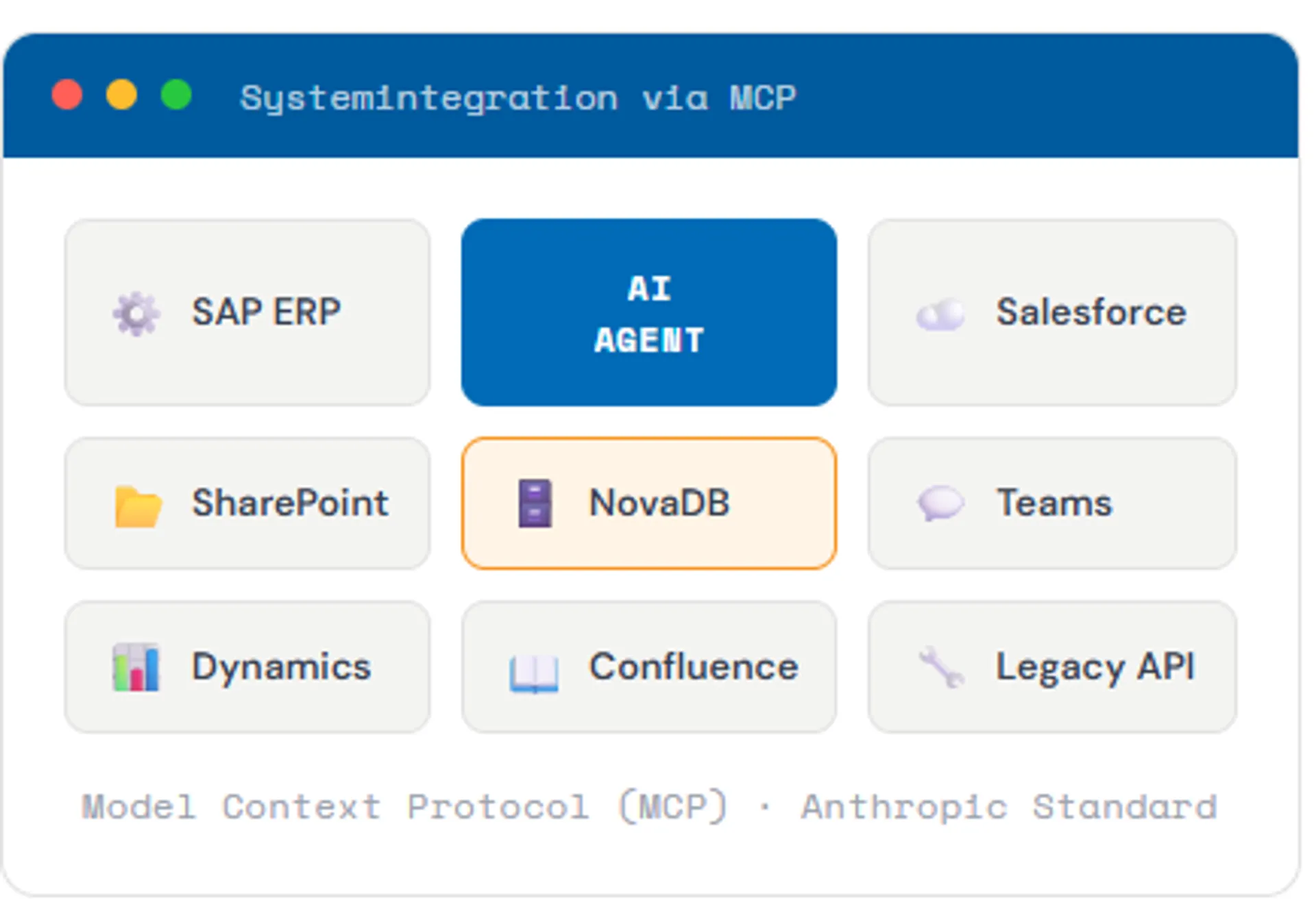 Über individuelle MCP-Server verbinden wir Ihre KI-Agenten mit nahezu jedem Unternehmenssystem, von SAP bis Salesforce, bis zu proprietären Legacy-Systemen.
