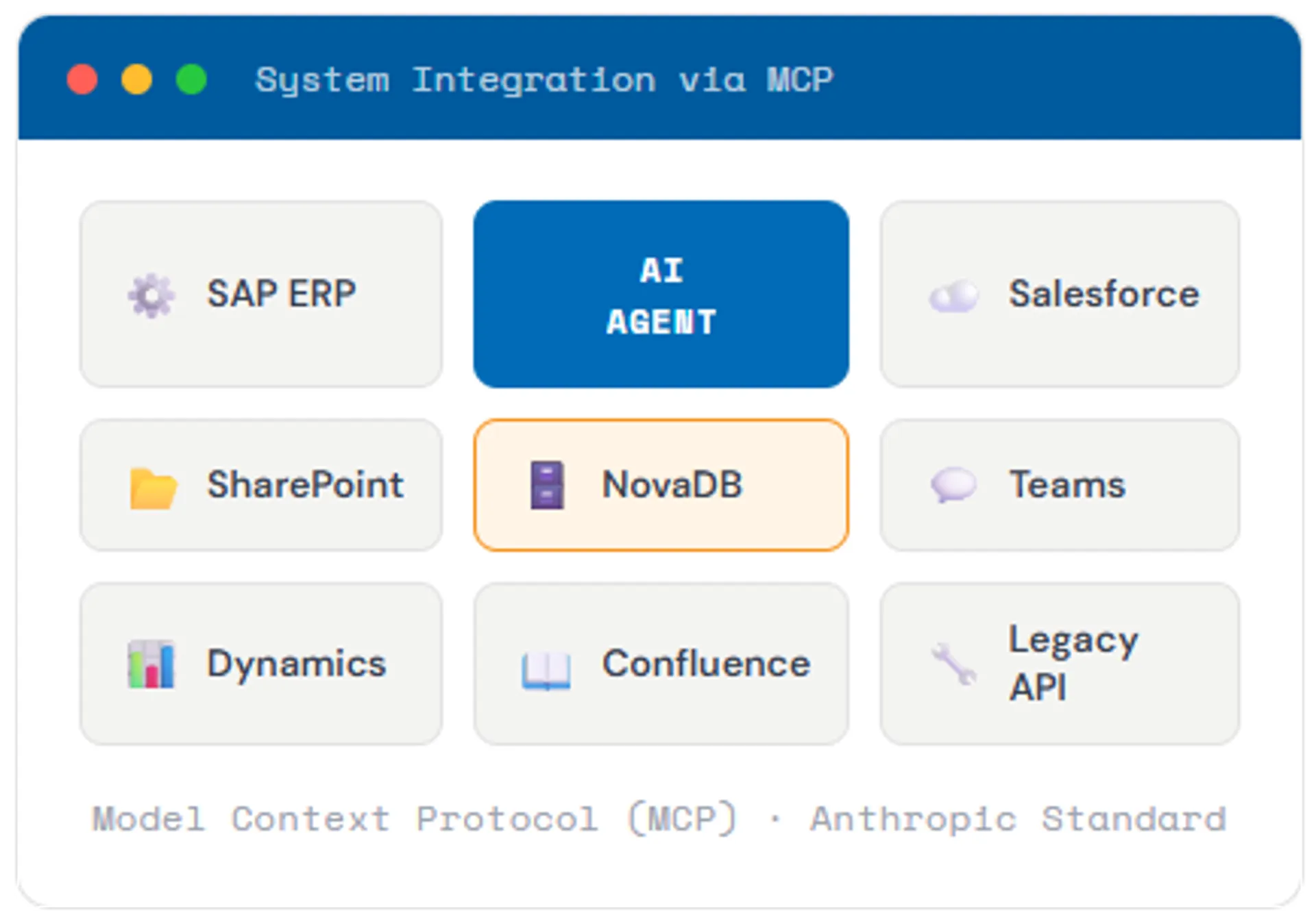 Using custom MCP servers, we connect your AI agents to virtually any enterprise system, from SAP to Salesforce to proprietary legacy systems.