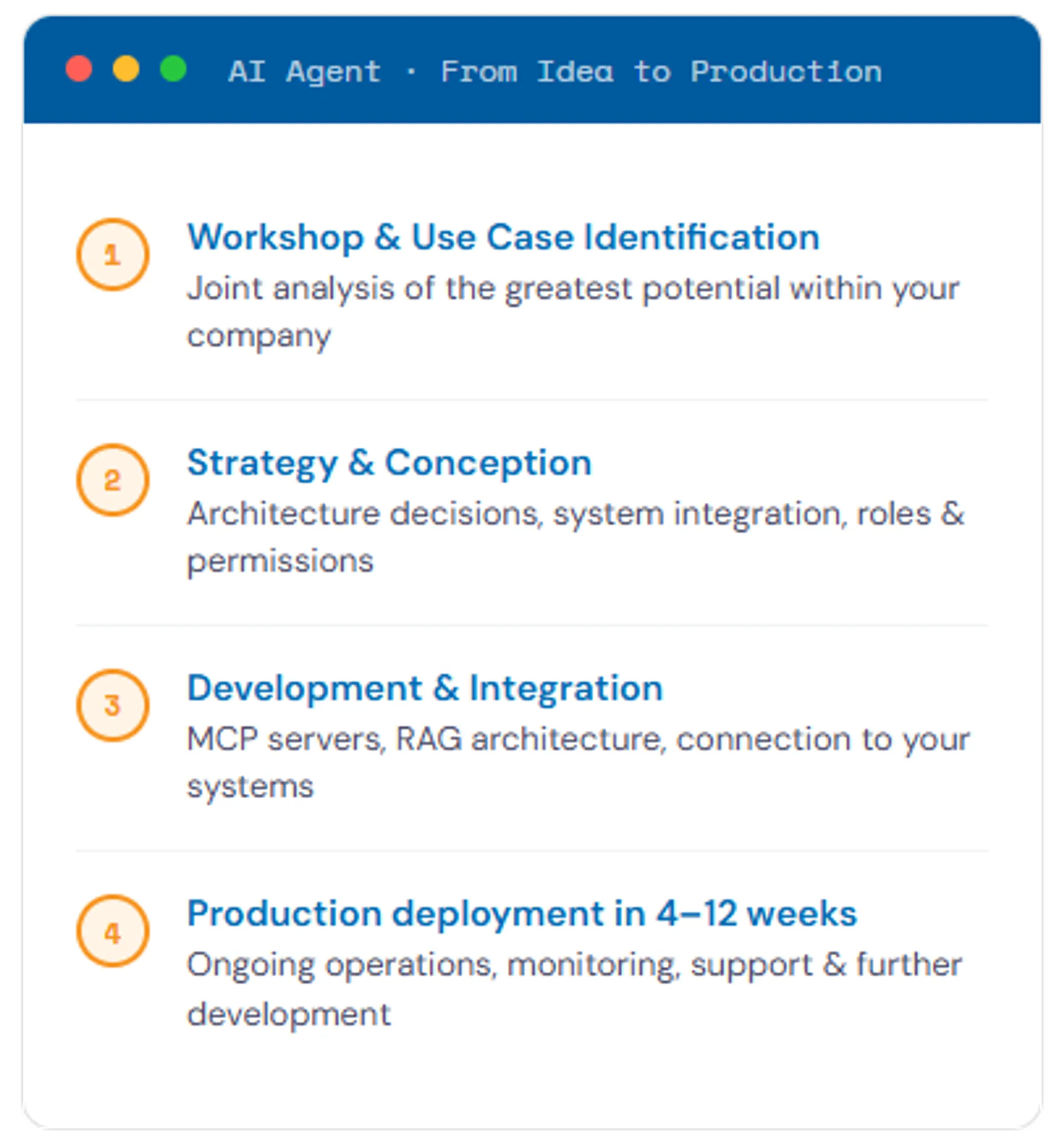 Our AI agents are not isolated tools. The real added value only emerges when AI agents are directly integrated into business processes: with access to real-time data, clear roles, permissions, and a stable architecture.