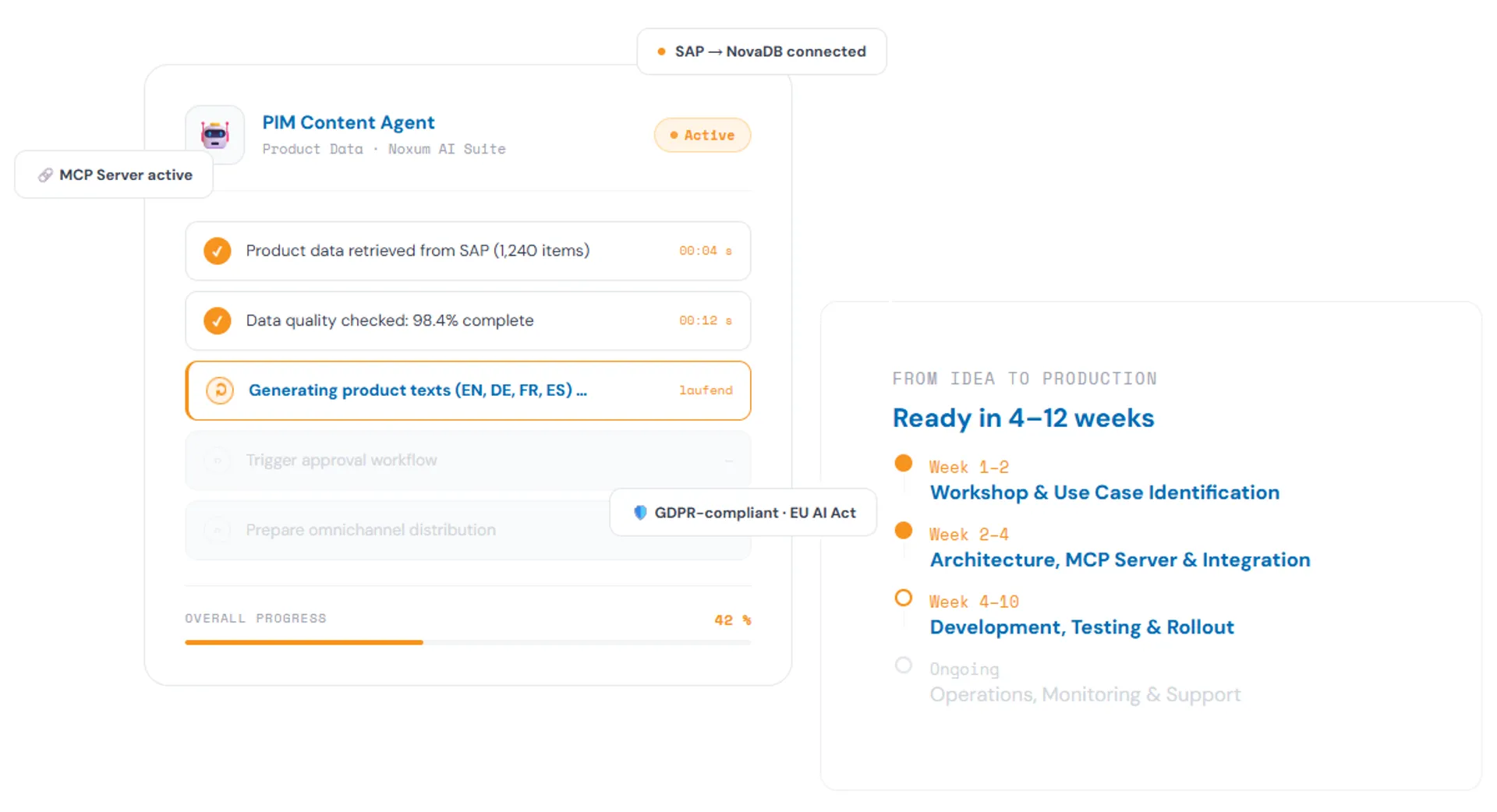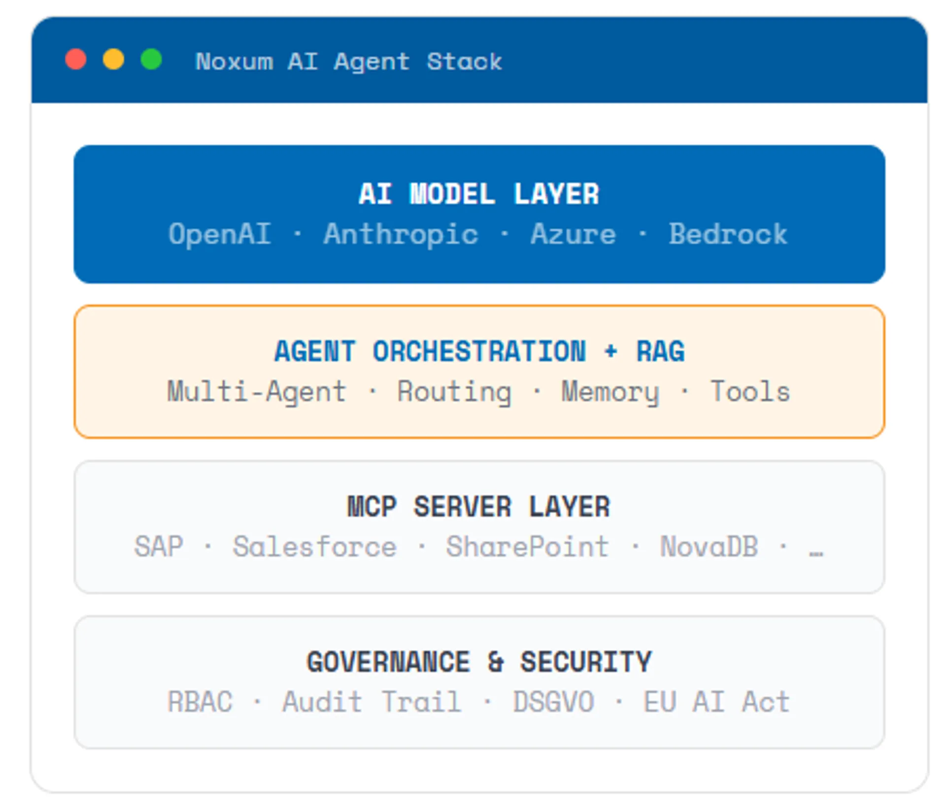 Noxum develops AI agents that are platform-independent and selects the right technology for your use case. We incorporate regulatory requirements such as the EU AI Act, NIS 2, and GDPR as architectural principles from the very beginning, rather than as an afterthought.